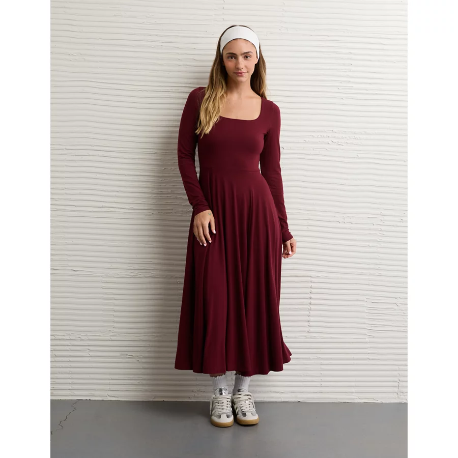 AE Square Neck Side Slit Midi Dress – Preppy Red