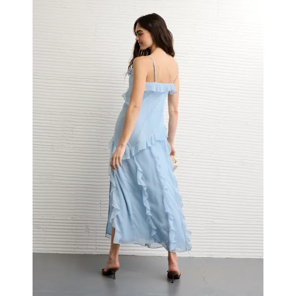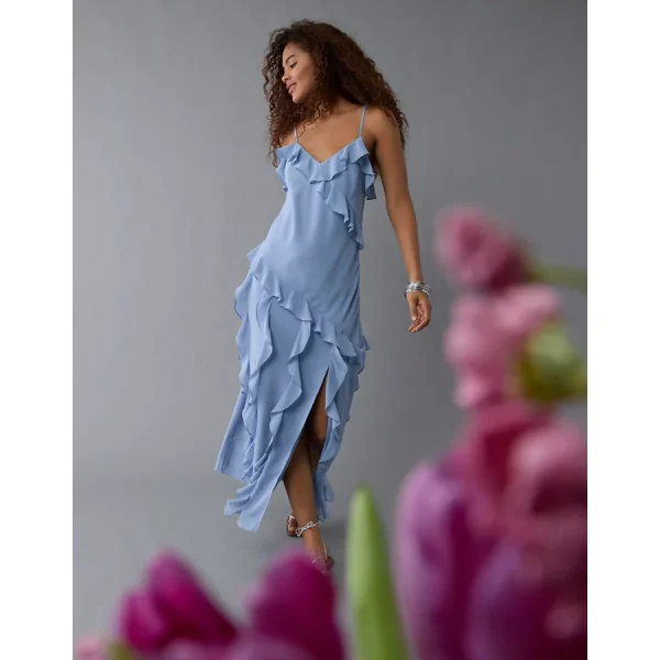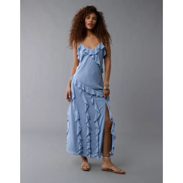 AE Asymmetrical Ruffle Maxi Slip Dress – Light Blue