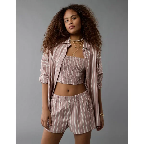 Crisp cotton fabricOversized button-up shirtSmocked tank topShorts with elastic waist 100% CottonMachine washImported