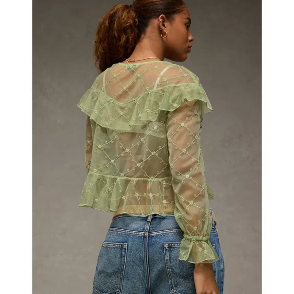 AE Embroidered Tie-Front Mesh Blouse – Green