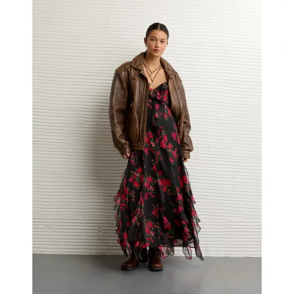 Tiered and ruffled fabricationScoop neckSleevelessThin spaghetti straps 100% Recycled PolyesterMachine washImported Fitted top & flared bottomMaxi length