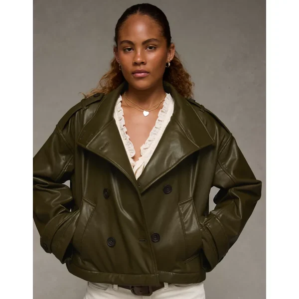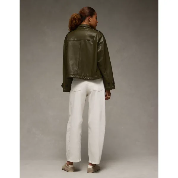 AE Faux Leather Cropped Bomber Jacket – Olive