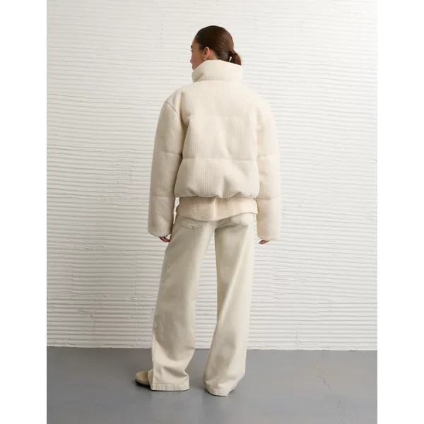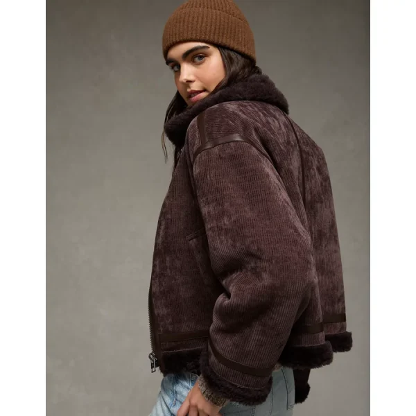 Corduroy exteriorSherpa collar, cuffs, and liningZip-up frontSide pockets 100% Recycled PolyesterSpot clean with damp ragImported Standard fitCropped length