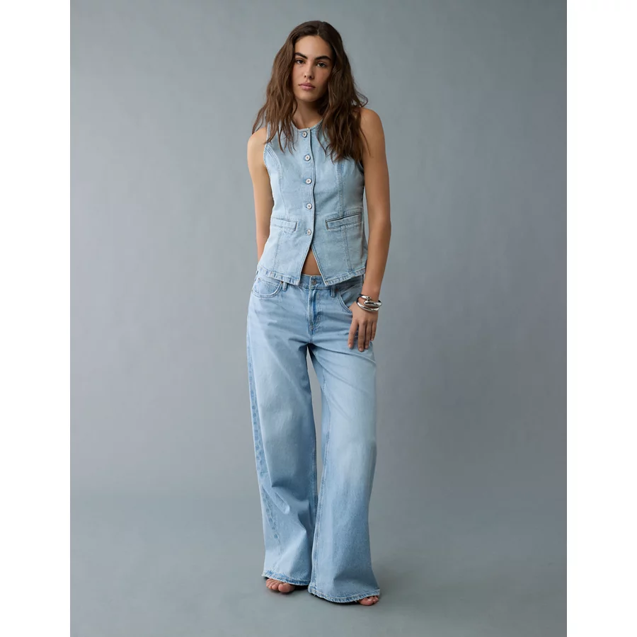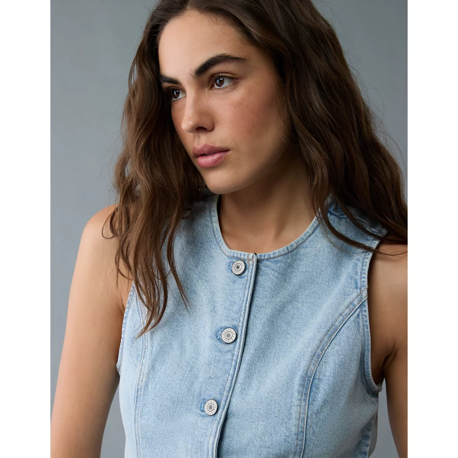 AE Crew Neck Button-Up Denim Vest – Light Wash