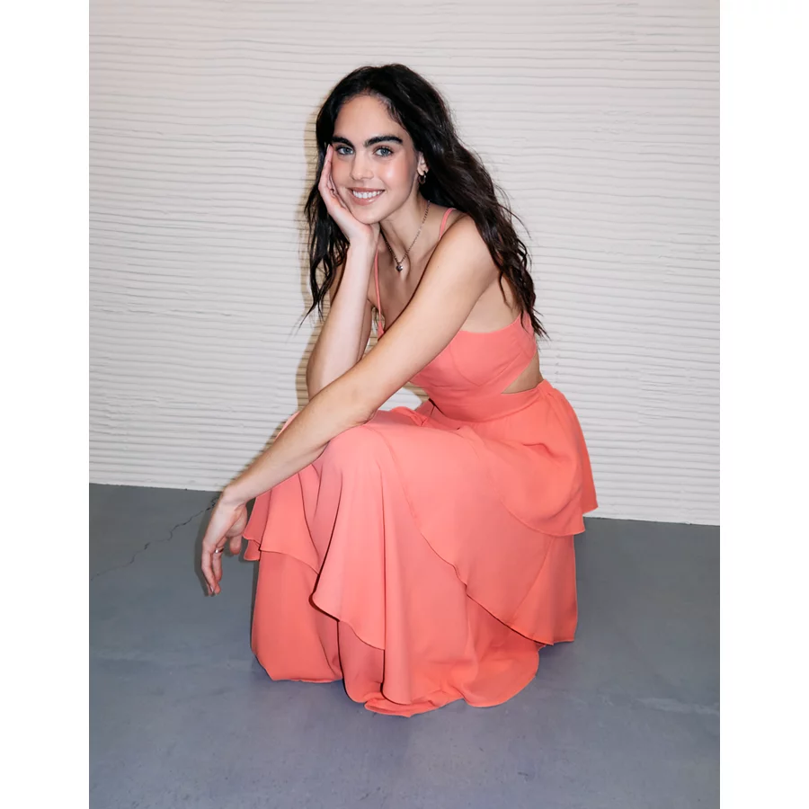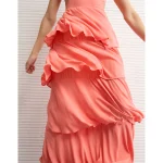 Chiffon fabricV-neckAsymmetrical ruffle details throughoutLeg slit 100% CottonMachine washImported Slip dress silhouetteMaxi lengthSleeveless