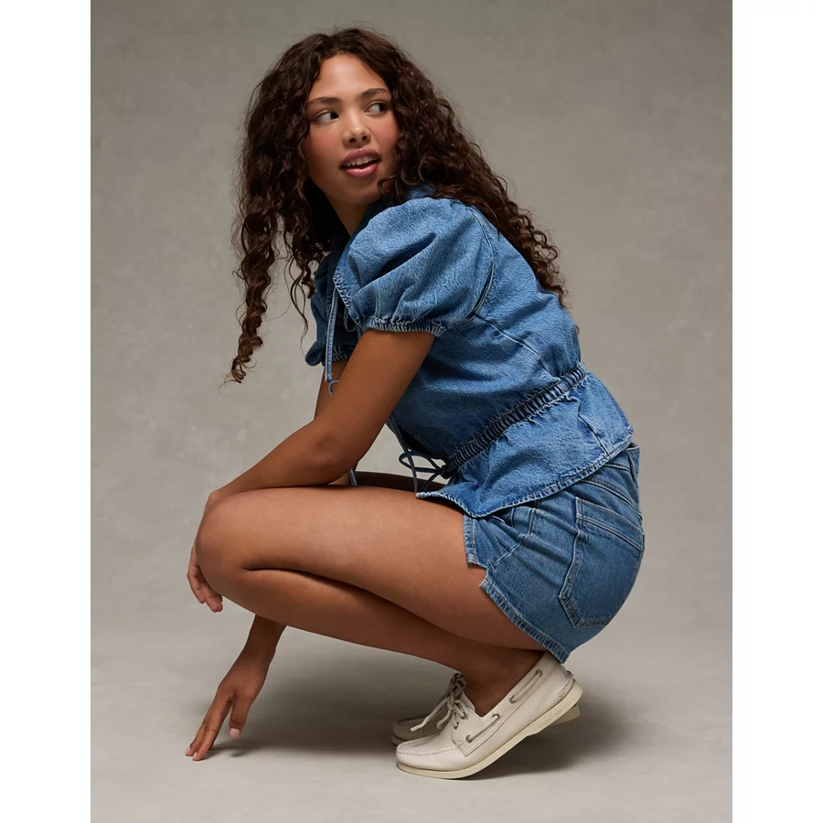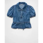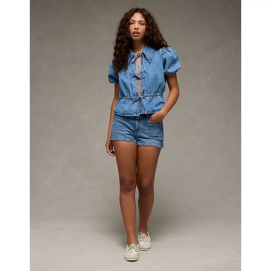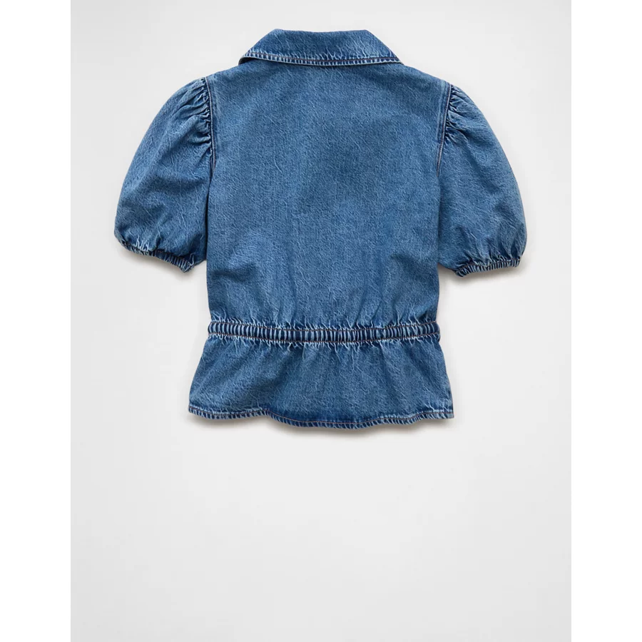 AE Denim Collared Puff Sleeve Tie Front Shirt – Medium Wash