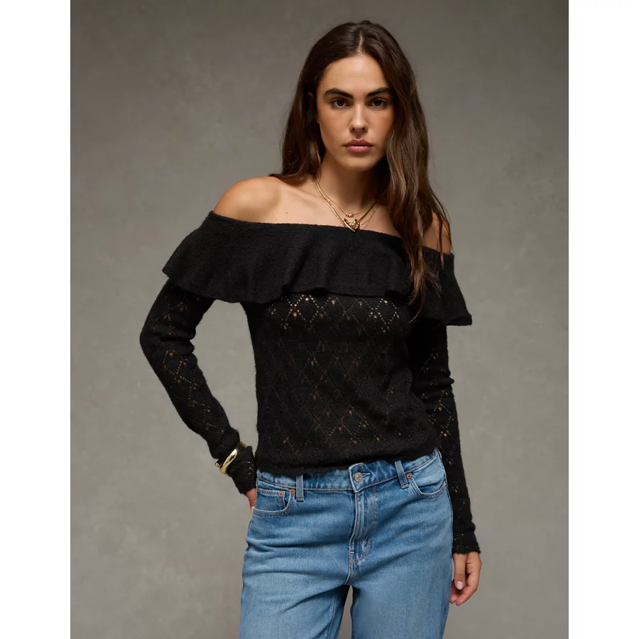 AE Ruffle Off-The-Shoulder Sweater – Bold Black