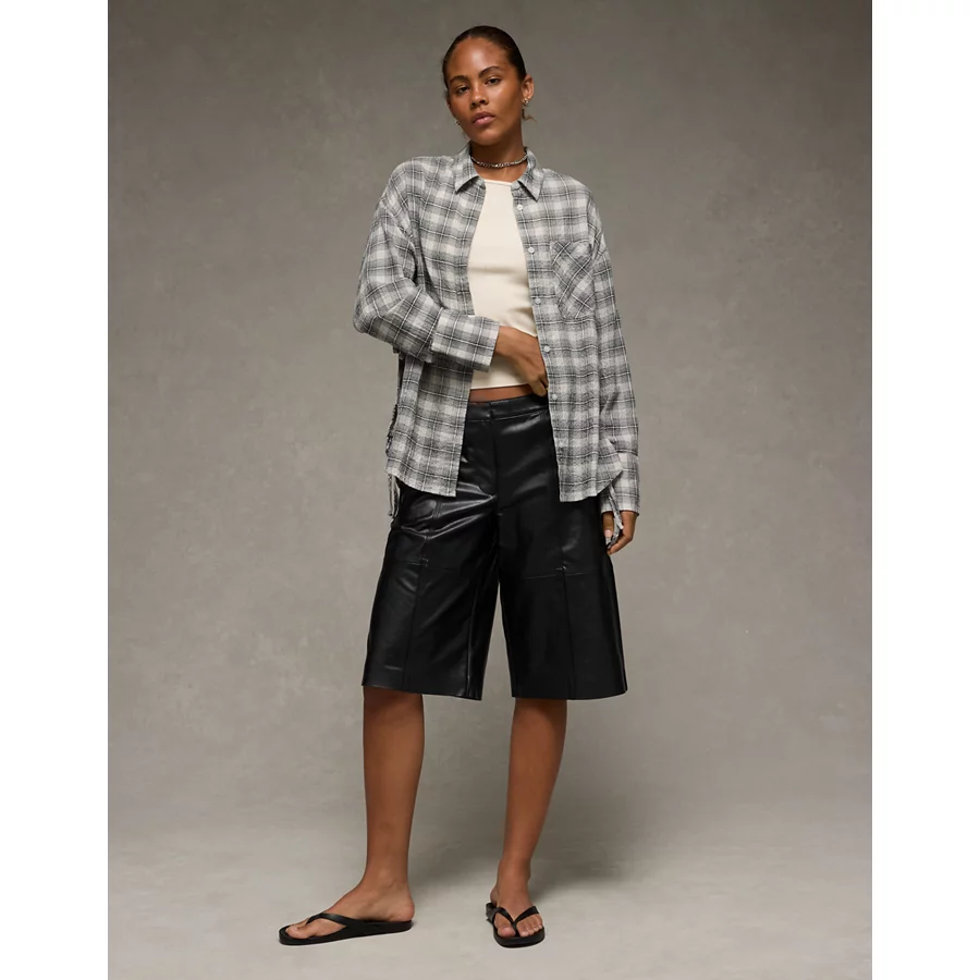 Lightweight fabric with stretchTrouser-inspired pocket stylingPleated front 63% Recycled Polyester, 33% Viscose, 4% SpandexMachine washImported 11 high riseRelaxed fit6 inseam