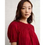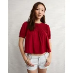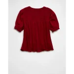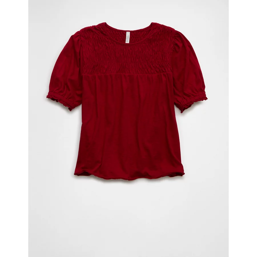 AE Sunchaser High Neck Puff Sleeve Smocked T-Shirt – Berry