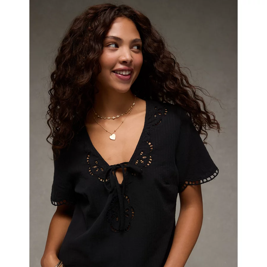 AE V-Neck Embroidered Mini Shift Dress – Black
