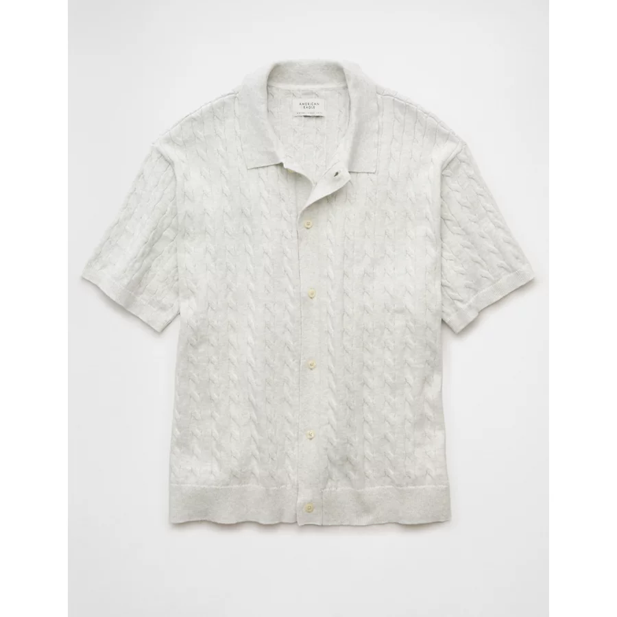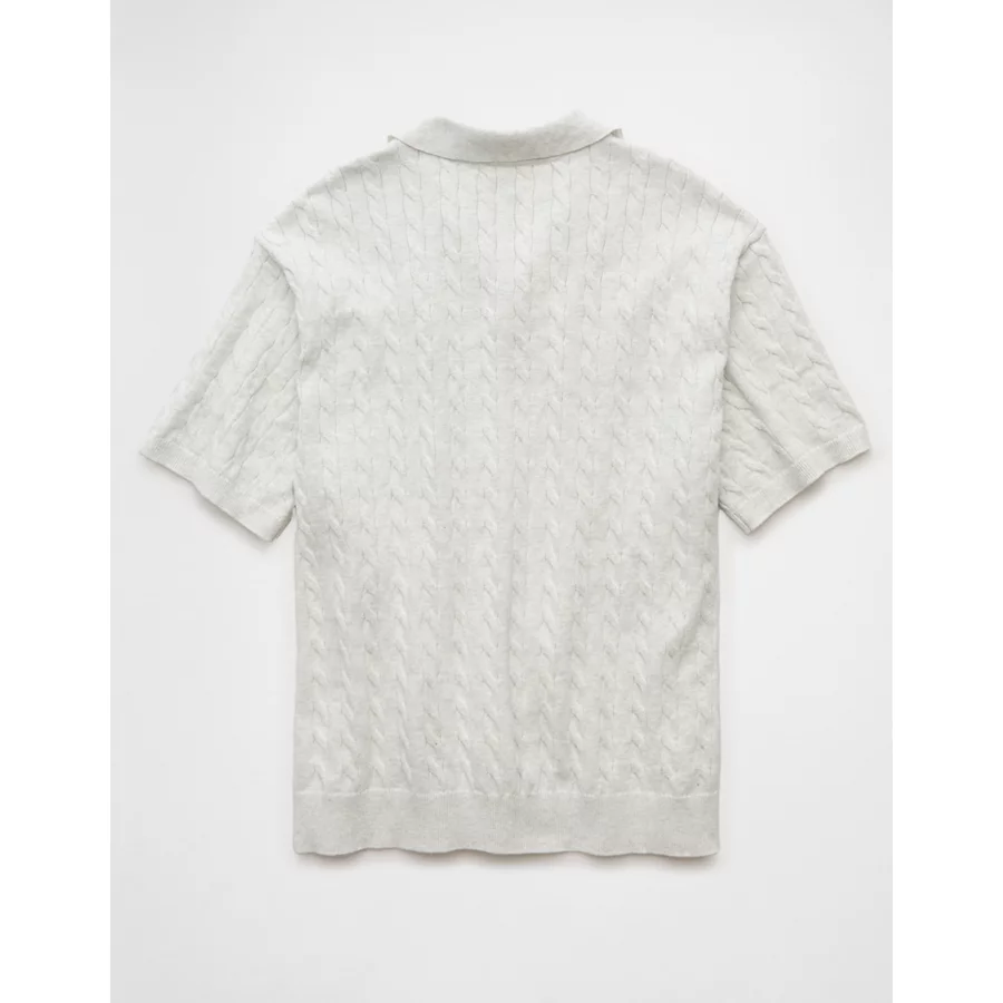 AE Weekend Cable Knit Button-Up Sweater Polo Shirt – Light Heather Gray