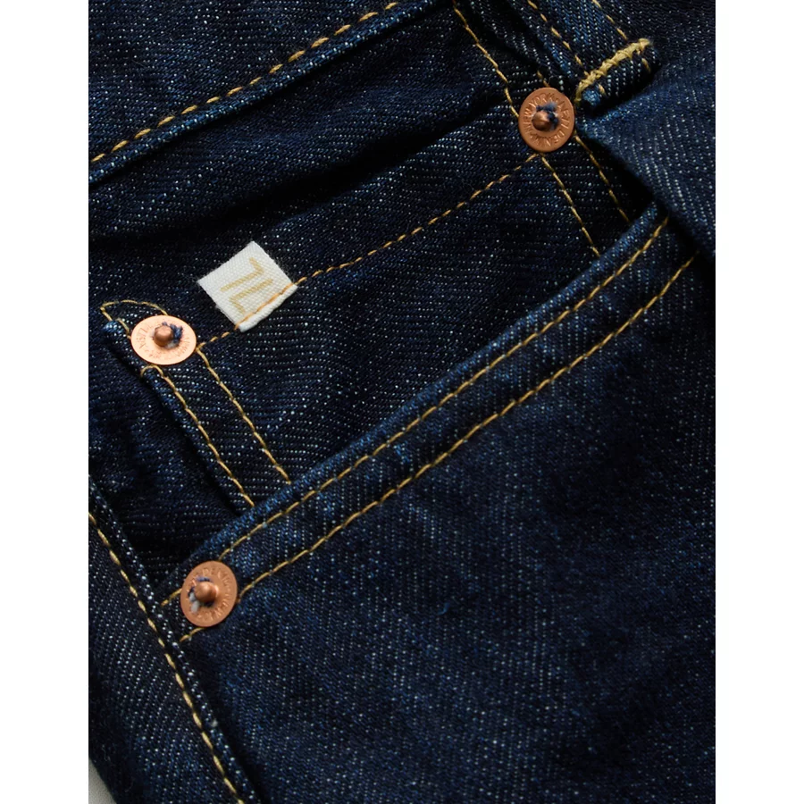Feels like: Heavyweight dark wash rigid selvedge denim that molds to your body over time