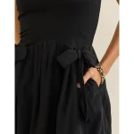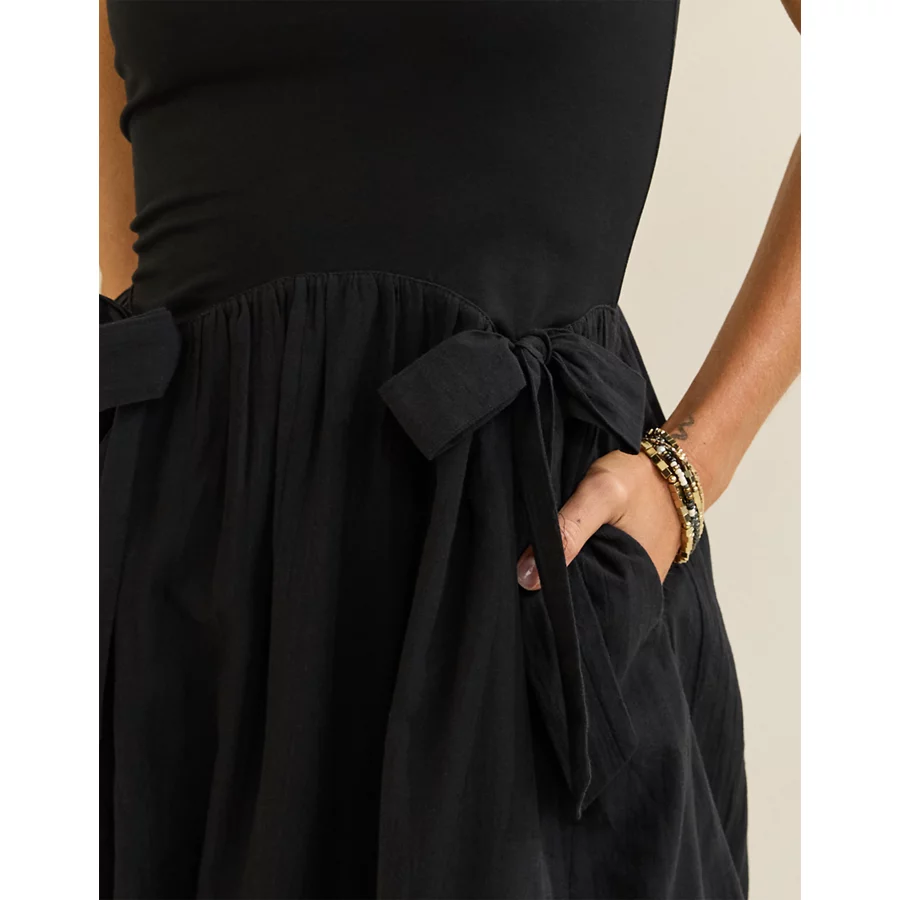 Mixed fabrics! Soft, stretchy knit bodice with a lightweight gauzey skirtScoop necklineSide seam pockets (!!)Accessibility deets: over-the-head access for easy