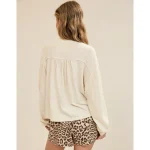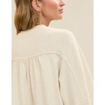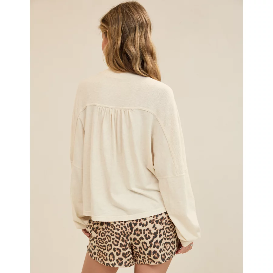 Real Good Everyday yarnRolled necklineRibbed trim on cuffs and hemPointelle deets and split cuffs on the sleevesThis style is heathered