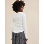 Real Good Everyday yarnRolled necklineRibbed trim on cuffs and hemPointelle deets and split cuffs on the sleevesStripedAccessibility deets: over-the-head access