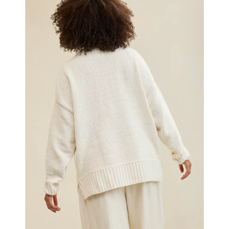 Real Good Everyday yarnRolled necklineRibbed trim on cuffs and hemPointelle deets and split cuffs on the sleevesThis style is heathered