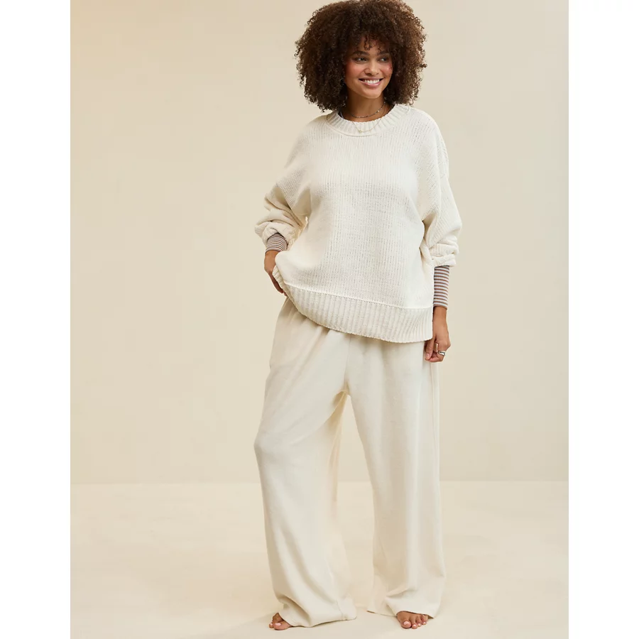 Real Good Everyday yarnRolled necklineRibbed trim on cuffs and hemPointelle deets and split cuffs on the sleevesStripedAccessibility deets: over-the-head access