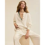 Real Good Everyday yarnRolled necklineRibbed trim on cuffs and hemPointelle deets and split cuffs on the sleevesStripedAccessibility deets: over-the-head access