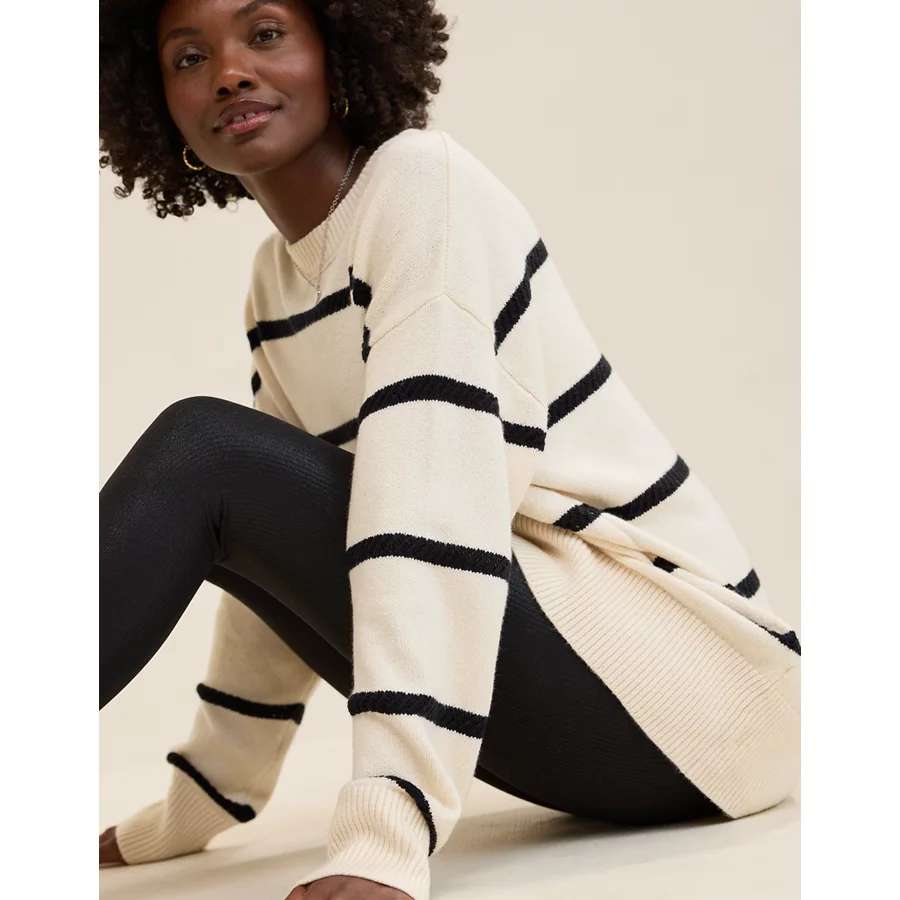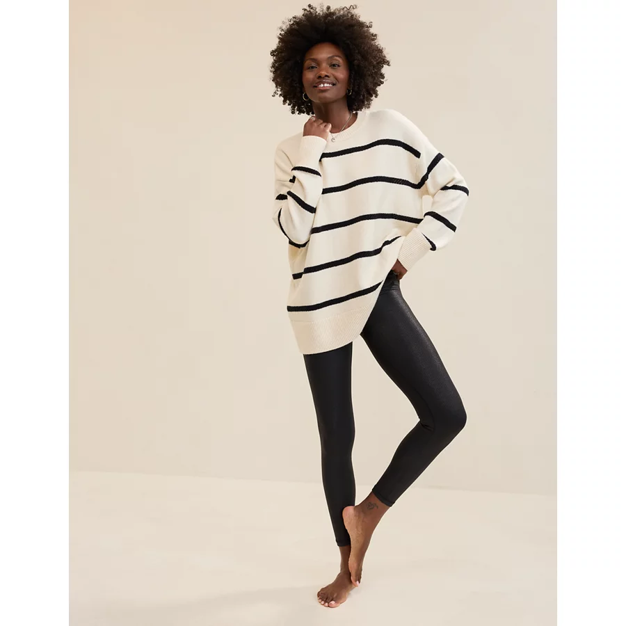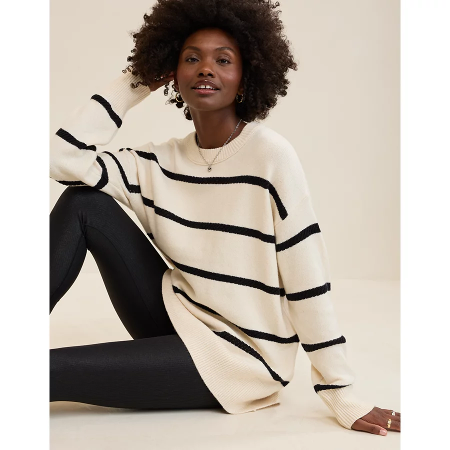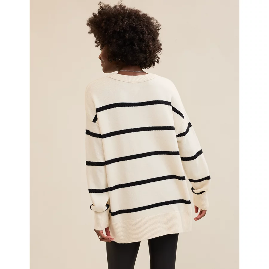Real Good Everyday yarnRolled necklineRibbed trim on cuffs and hemPointelle deets and split cuffs on the sleevesStripedAccessibility deets: over-the-head access