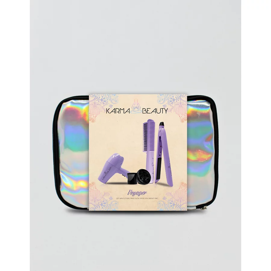Includes a 0.9 Ceramic Flat Iron, compact Travel Blow Dryer, Mini Serenity Heated Styling Comb