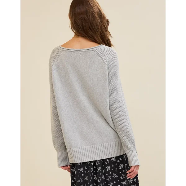 Real Good Everyday yarnRolled necklineRibbed trim on cuffs and hemPointelle deets and split cuffs on the sleevesThis style is heathered