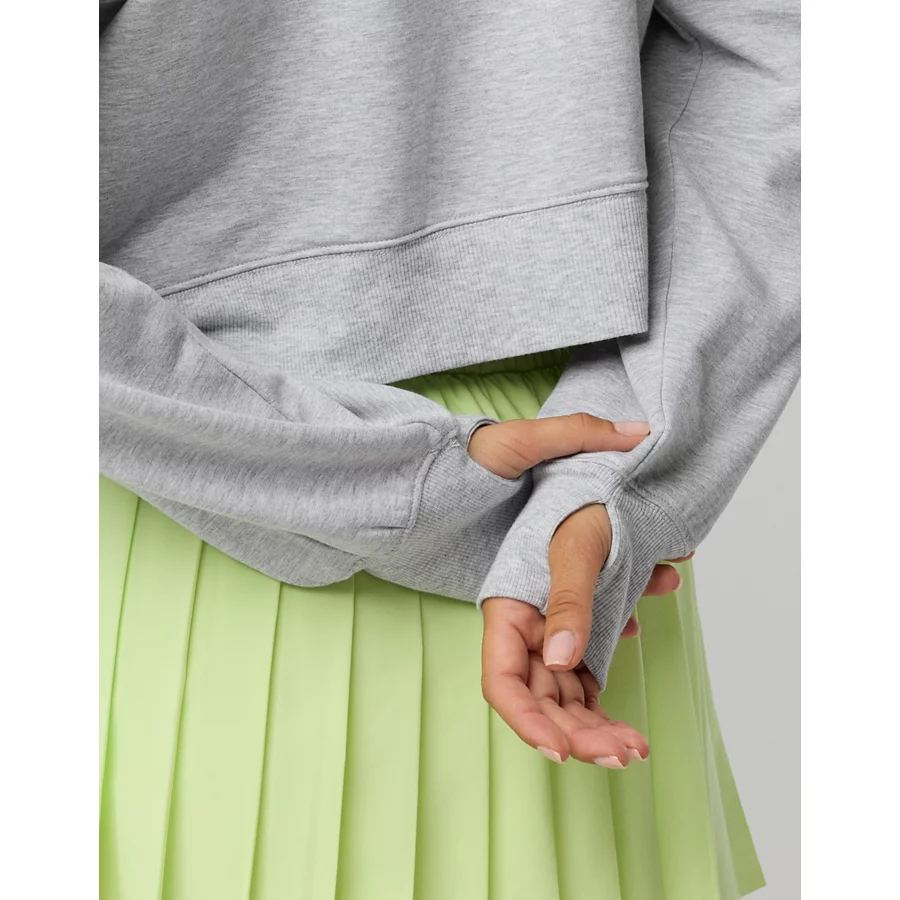 Real Good Everyday yarnRolled necklineRibbed trim on cuffs and hemPointelle deets and split cuffs on the sleevesThis style is heathered