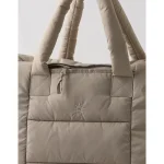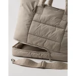 THE LOOK: Lightweight puffy fabric that feels like a cloud (AKA bag of our dreams). Adjustable strap with logo & a band to slide onto a suitcase (here you come travel days)!