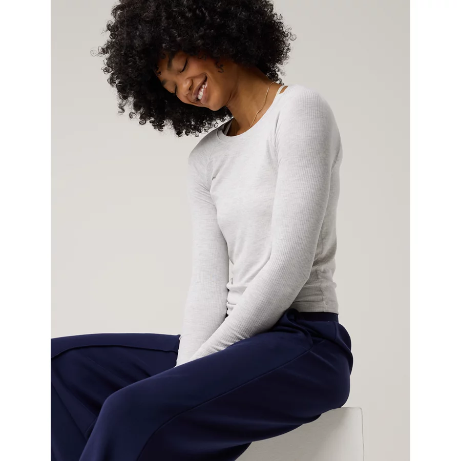Real Good Everyday yarnRolled necklineRibbed trim on cuffs and hemPointelle deets and split cuffs on the sleevesThis style is heathered
