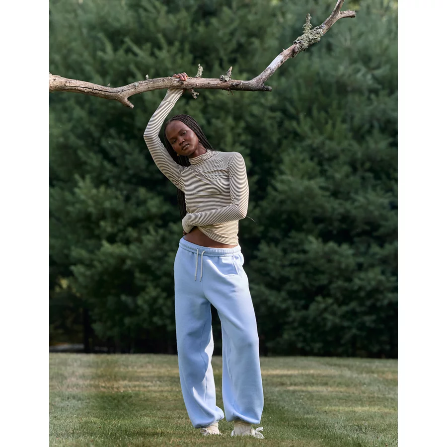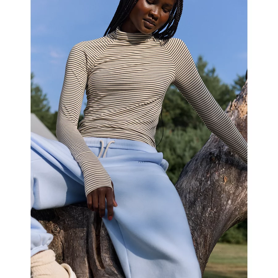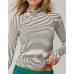 Real Good Everyday yarnRolled necklineRibbed trim on cuffs and hemPointelle deets and split cuffs on the sleevesStripedAccessibility deets: over-the-head access