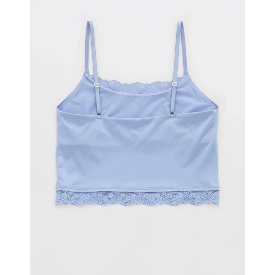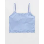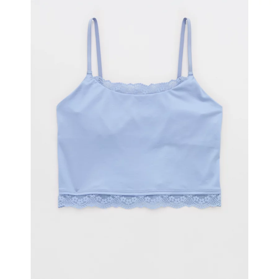 Design: Lace trim along neckline and bottom hem. Crop length hits at waist.
