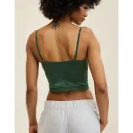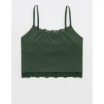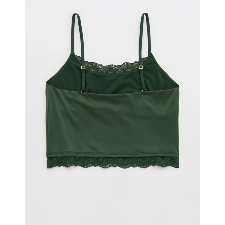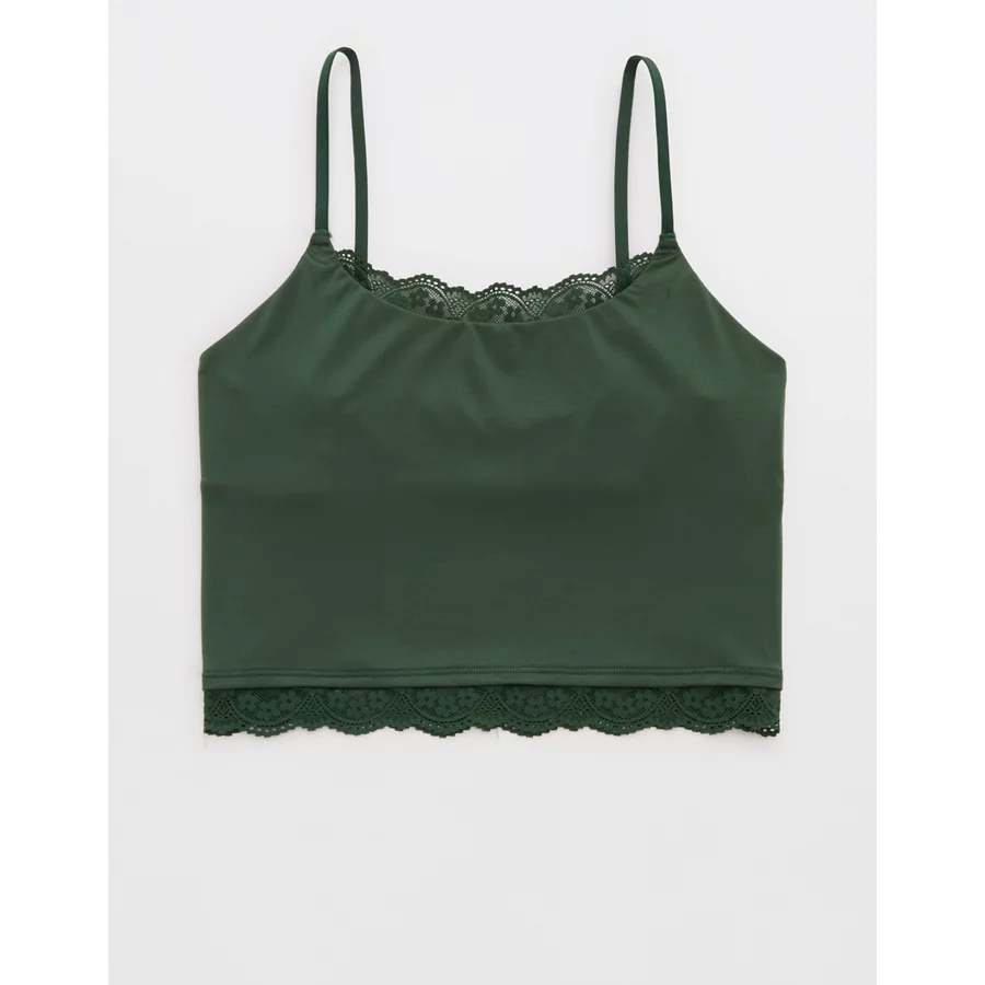 Design: Lace trim along neckline and bottom hem. Crop length hits at waist.